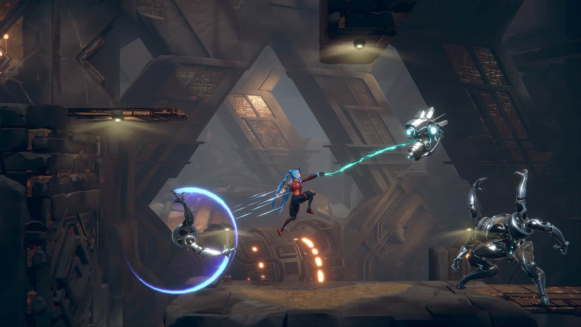 我们充分利用之前开发格斗游戏的经验,设计出了这款游戏的武器和攻击系统。你将能够施展滑行、冲刺和闪避来应对敌人的攻击,并使用一系列特殊武器和技能酣畅淋漓地进行回击。